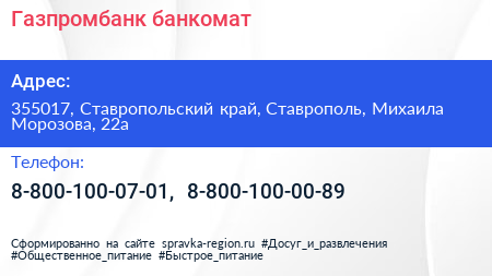 Газпромбанк, банкомат по адресу 355017, Ставропольский край, Ставрополь, Михаила Морозова, 22а в дальнейшем Организация, размещена в следующих категориях: