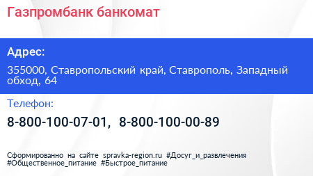 Газпромбанк, банкомат по адресу 355000, Ставропольский край, Ставрополь, Западный обход, 64 в дальнейшем Организация, размещена в следующих категориях: