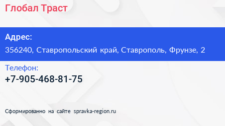 Глобал Траст по адресу 356240, Ставропольский край, Ставрополь, Фрунзе, 2 в дальнейшем Организация, размещена в следующих категориях: