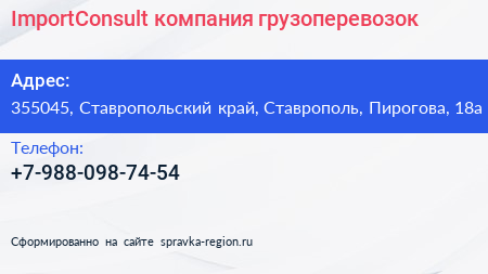 ImportConsult, компания грузоперевозок по адресу 355045, Ставропольский край, Ставрополь, Пирогова, 18а в дальнейшем Организация, размещена в следующих категориях:
