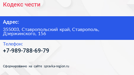 Кодекс чести по адресу 355003, Ставропольский край, Ставрополь, Дзержинского, 156 в дальнейшем Организация, размещена в следующих категориях: