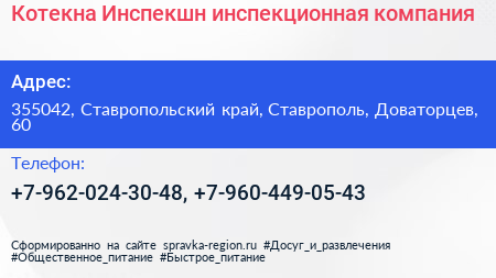 Котекна Инспекшн, инспекционная компания по адресу 355042, Ставропольский край, Ставрополь, Доваторцев, 60 в дальнейшем Организация, размещена в следующих категориях: