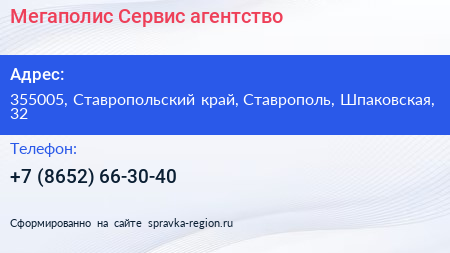 Мегаполис Сервис, агентство по адресу 355005, Ставропольский край, Ставрополь, Шпаковская, 32 в дальнейшем Организация, размещена в следующих категориях:
