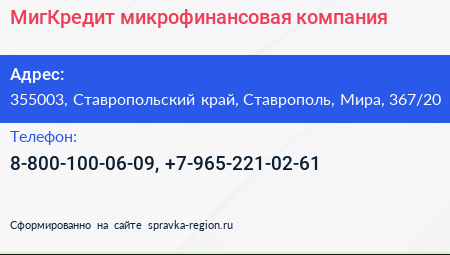 МигКредит, микрофинансовая компания по адресу 355003, Ставропольский край, Ставрополь, Мира, 367/20 в дальнейшем Организация, размещена в следующих категориях: