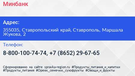 Минбанк по адресу 355035, Ставропольский край, Ставрополь, Маршала Жукова, 2 в дальнейшем Организация, размещена в следующих категориях: