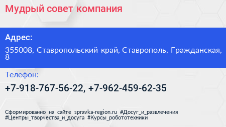 Мудрый совет, компания по адресу 355008, Ставропольский край, Ставрополь, Гражданская, 8 в дальнейшем Организация, размещена в следующих категориях: