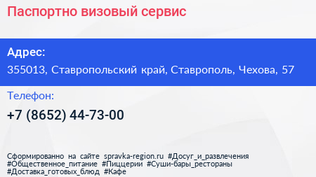 Паспортно-визовый сервис по адресу 355013, Ставропольский край, Ставрополь, Чехова, 57 в дальнейшем Организация, размещена в следующих категориях: