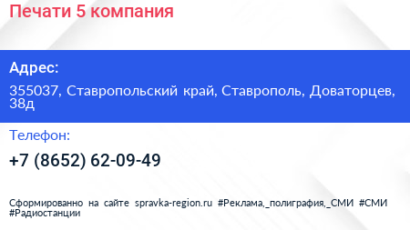 Печати 5, компания по адресу 355037, Ставропольский край, Ставрополь, Доваторцев, 38д в дальнейшем Организация, размещена в следующих категориях: