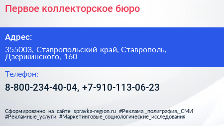 Первое коллекторское бюро по адресу 355003, Ставропольский край, Ставрополь, Дзержинского, 160 в дальнейшем Организация, размещена в следующих категориях: