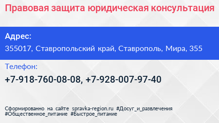 Правовая защита, юридическая консультация по адресу 355017, Ставропольский край, Ставрополь, Мира, 355 в дальнейшем Организация, размещена в следующих категориях: