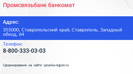 Промсвязьбанк, банкомат по адресу 355000, Ставропольский край, Ставрополь, Западный обход, 64 в дальнейшем Организация, размещена в следующих категориях: