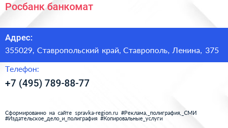Росбанк, банкомат по адресу 355029, Ставропольский край, Ставрополь, Ленина, 375 в дальнейшем Организация, размещена в следующих категориях: