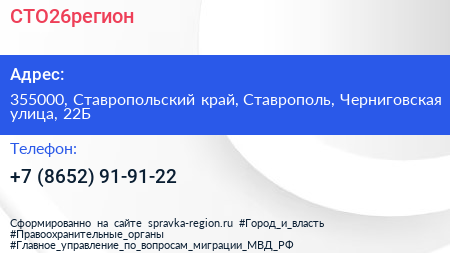 СТО26регион по адресу 355000, Ставропольский край, Ставрополь, Черниговская улица, 22Б в дальнейшем Организация, размещена в следующих категориях: