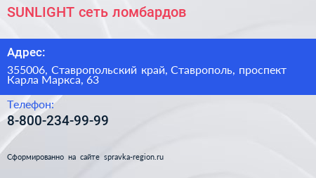 SUNLIGHT, сеть ломбардов по адресу 355006, Ставропольский край, Ставрополь, проспект Карла Маркса, 63 в дальнейшем Организация, размещена в следующих категориях: