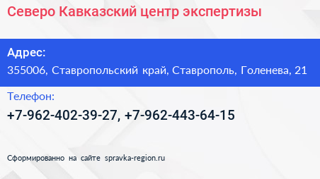 Северо-Кавказский центр экспертизы по адресу 355006, Ставропольский край, Ставрополь, Голенева, 21 в дальнейшем Организация, размещена в следующих категориях: