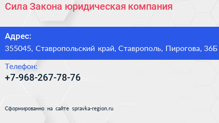 Сила Закона, юридическая компания по адресу 355045, Ставропольский край, Ставрополь, Пирогова, 36Б в дальнейшем Организация, размещена в следующих категориях: