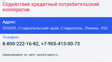 Содействие, кредитный потребительский кооператив по адресу 355029, Ставропольский край, Ставрополь, Ленина, 452 в дальнейшем Организация, размещена в следующих категориях: