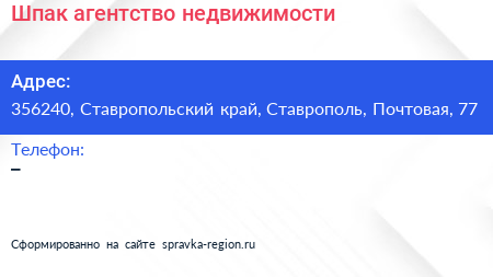 Шпак, агентство недвижимости по адресу 356240, Ставропольский край, Ставрополь, Почтовая, 77 в дальнейшем Организация, размещена в следующих категориях: