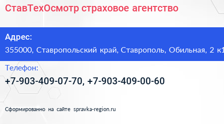 СтавТехОсмотр, страховое агентство по адресу 355000, Ставропольский край, Ставрополь, Обильная, 2 к1 в дальнейшем Организация, размещена в следующих категориях: