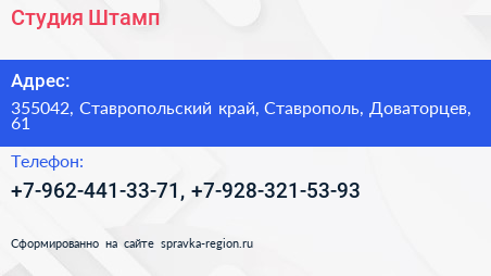 Студия Штамп по адресу 355042, Ставропольский край, Ставрополь, Доваторцев, 61 в дальнейшем Организация, размещена в следующих категориях: