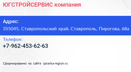ЮГСТРОЙСЕРВИС, компания по адресу 355045, Ставропольский край, Ставрополь, Пирогова, 68а в дальнейшем Организация, размещена в следующих категориях: