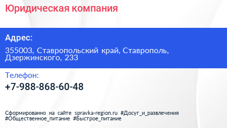 Юридическая компания по адресу 355003, Ставропольский край, Ставрополь, Дзержинского, 233 в дальнейшем Организация, размещена в следующих категориях: