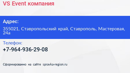 VS Event, компания по адресу 355021, Ставропольский край, Ставрополь, Мастеровая, 24а в дальнейшем Организация, размещена в следующих категориях: