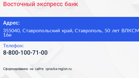 Восточный экспресс банк по адресу 355040, Ставропольский край, Ставрополь, 50 лет ВЛКСМ, 16и в дальнейшем Организация, размещена в следующих категориях: