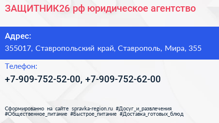 ЗАЩИТНИК26.рф, юридическое агентство по адресу 355017, Ставропольский край, Ставрополь, Мира, 355 в дальнейшем Организация, размещена в следующих категориях: