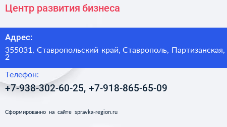 Центр развития бизнеса по адресу 355031, Ставропольский край, Ставрополь, Партизанская, 2 в дальнейшем Организация, размещена в следующих категориях: