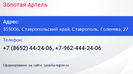 Золотая Артель по адресу 355006, Ставропольский край, Ставрополь, Голенева, 27 в дальнейшем Организация, размещена в следующих категориях: