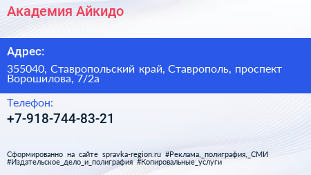 Академия Айкидо по адресу 355040, Ставропольский край, Ставрополь, проспект Ворошилова, 7/2а в дальнейшем Организация, размещена в следующих категориях: