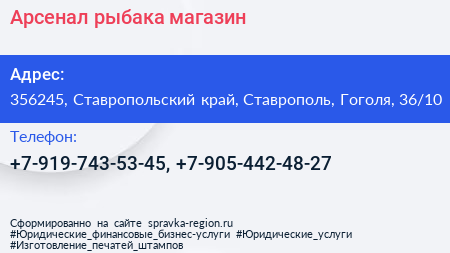 Арсенал рыбака, магазин по адресу 356245, Ставропольский край, Ставрополь, Гоголя, 36/10 в дальнейшем Организация, размещена в следующих категориях: