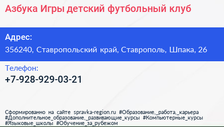 Азбука Игры, детский футбольный клуб по адресу 356240, Ставропольский край, Ставрополь, Шпака, 26 в дальнейшем Организация, размещена в следующих категориях:
