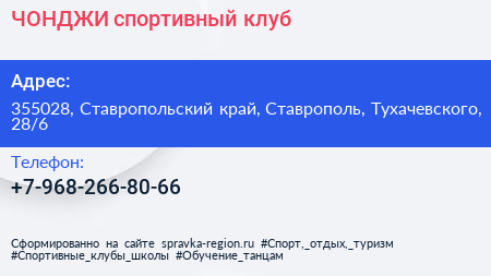 ЧОНДЖИ, спортивный клуб по адресу 355028, Ставропольский край, Ставрополь, Тухачевского, 28/6 в дальнейшем Организация, размещена в следующих категориях: