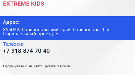 EXTREME KIDS по адресу 355042, Ставропольский край, Ставрополь, 1-й Параллельный проезд, 6 в дальнейшем Организация, размещена в следующих категориях: