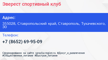 Эверест, спортивный клуб по адресу 355028, Ставропольский край, Ставрополь, Тухачевского, 30 в дальнейшем Организация, размещена в следующих категориях: