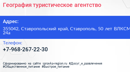 География, туристическое агентство по адресу 355042, Ставропольский край, Ставрополь, 50 лет ВЛКСМ, 24а в дальнейшем Организация, размещена в следующих категориях: