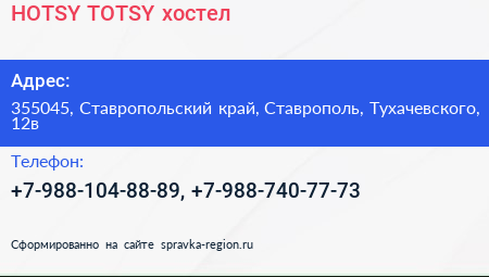 HOTSY-TOTSY, хостел по адресу 355045, Ставропольский край, Ставрополь, Тухачевского, 12в в дальнейшем Организация, размещена в следующих категориях:
