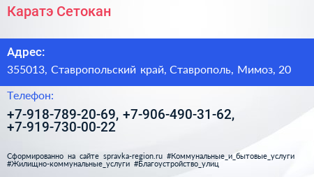 Каратэ Сетокан по адресу 355013, Ставропольский край, Ставрополь, Мимоз, 20 в дальнейшем Организация, размещена в следующих категориях: