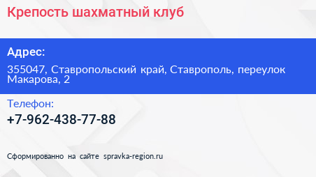 Крепость, шахматный клуб по адресу 355047, Ставропольский край, Ставрополь, переулок Макарова, 2 в дальнейшем Организация, размещена в следующих категориях: