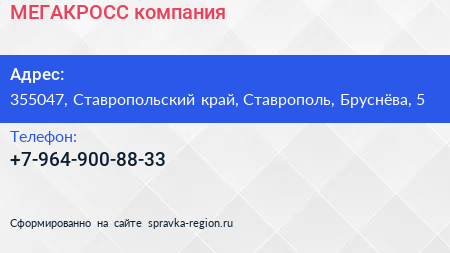 МЕГАКРОСС, компания по адресу 355047, Ставропольский край, Ставрополь, Бруснёва, 5 в дальнейшем Организация, размещена в следующих категориях: