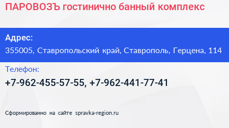 ПАРОВОЗЪ, гостинично-банный комплекс по адресу 355005, Ставропольский край, Ставрополь, Герцена, 114 в дальнейшем Организация, размещена в следующих категориях: