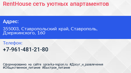 RentHouse, сеть уютных апартаментов по адресу 355003, Ставропольский край, Ставрополь, Дзержинского, 160 в дальнейшем Организация, размещена в следующих категориях: