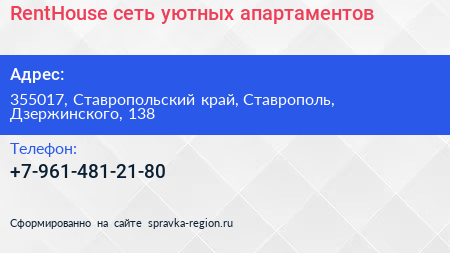 RentHouse, сеть уютных апартаментов по адресу 355017, Ставропольский край, Ставрополь, Дзержинского, 138 в дальнейшем Организация, размещена в следующих категориях: