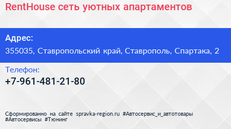 RentHouse, сеть уютных апартаментов по адресу 355035, Ставропольский край, Ставрополь, Спартака, 2 в дальнейшем Организация, размещена в следующих категориях: