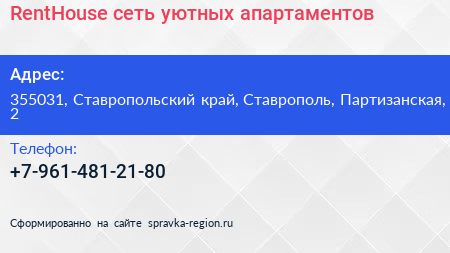 RentHouse, сеть уютных апартаментов по адресу 355031, Ставропольский край, Ставрополь, Партизанская, 2 в дальнейшем Организация, размещена в следующих категориях: