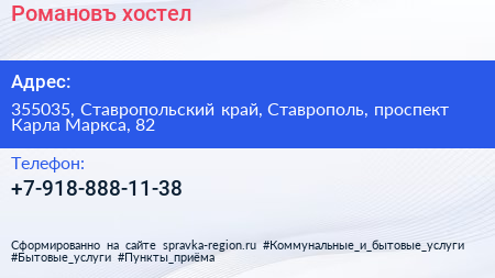 Романовъ, хостел по адресу 355035, Ставропольский край, Ставрополь, проспект Карла Маркса, 82 в дальнейшем Организация, размещена в следующих категориях: