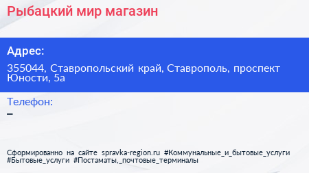 Рыбацкий мир, магазин по адресу 355044, Ставропольский край, Ставрополь, проспект Юности, 5а в дальнейшем Организация, размещена в следующих категориях: