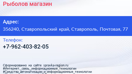 Рыболов, магазин по адресу 356240, Ставропольский край, Ставрополь, Почтовая, 77 в дальнейшем Организация, размещена в следующих категориях: